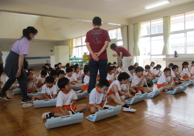 4時間目は、鍵盤ハーモニカの講習会。オアシス楽器店様のはからいで、専門の先生を招いての講習会でした。鍵盤の位置を教えてもらって、さっそく演奏しました。