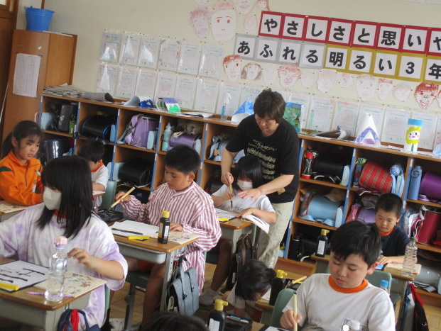 3年生の書写の授業風景です。真剣な様子で毛筆に取り組んでいました。