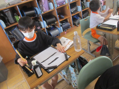 2組さんは書写の時間。横に一文字。筆圧しっかりした堂々として字の学習中です。