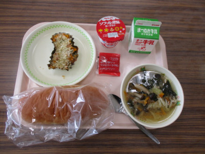 今日の給食は、日本の献立です。 セルフおにぎりなので、自分でおにぎりを作ってのりを巻いて食べました。おにぎりにはビニール袋をつけたので、袋にごはんを入れ、おにぎりをつくります。自分で作るおにぎりはとてもテンションが上がり、たのしい・おいしい給食の時間となりました。