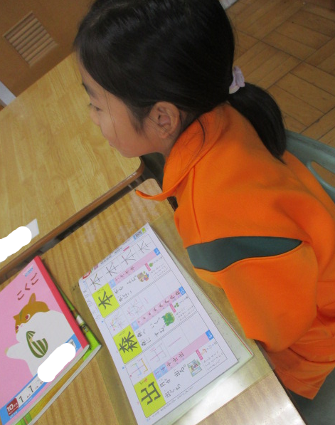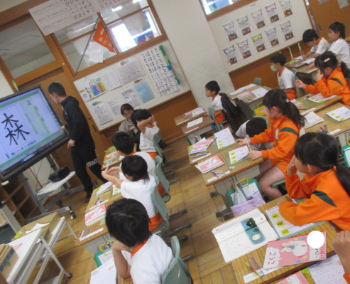 1組さんは国語の時間。進出漢字について学習中。担任曰く「森は3つ子ちゃんではないですよ。」子供たち「え~」