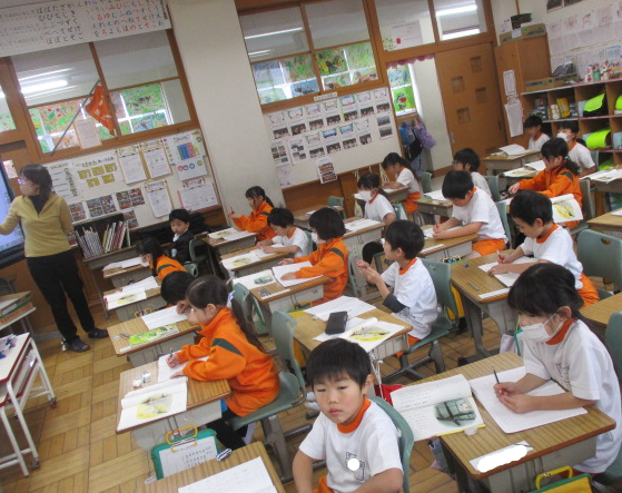 2組さんは国語の時間。たぬきの糸車の5の場面の学習中。カチカチ山と違って、タヌキの面白おかしい様子が1年生にはぴったりですね。