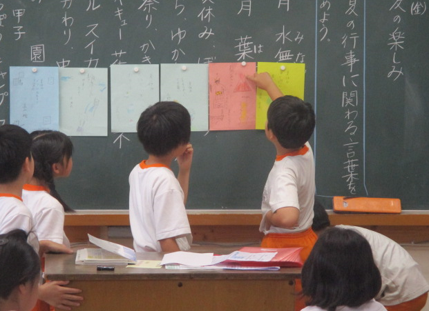 2組さんは国語の時間。「場(じょう)」と「場(ば)」の使い分けを確認中。