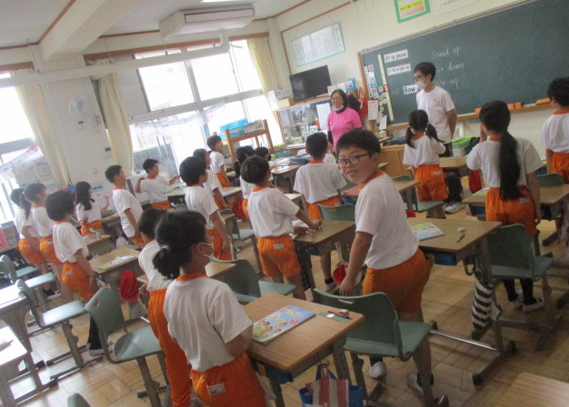 1組さんは。外国語活動。動作の学習「UP DOWN」「SIT DOWN」を聞いて動作。