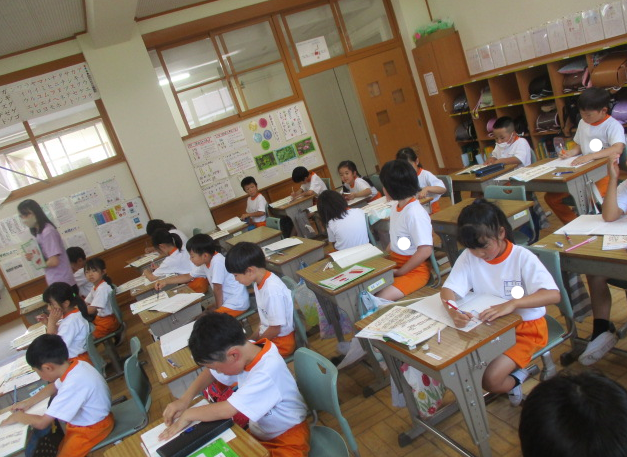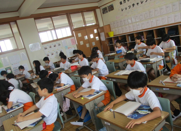 2組さんは国語の時間。心に響いたことを17字の俳句作成。担任の先生の作品を参考に、考え中。