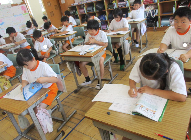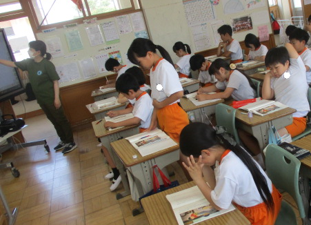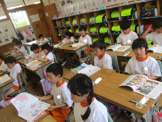 1組さんは国語の時間。戦争当時、「父親はなぜ娘を高い高いするのか?」の根拠をみつけていました。