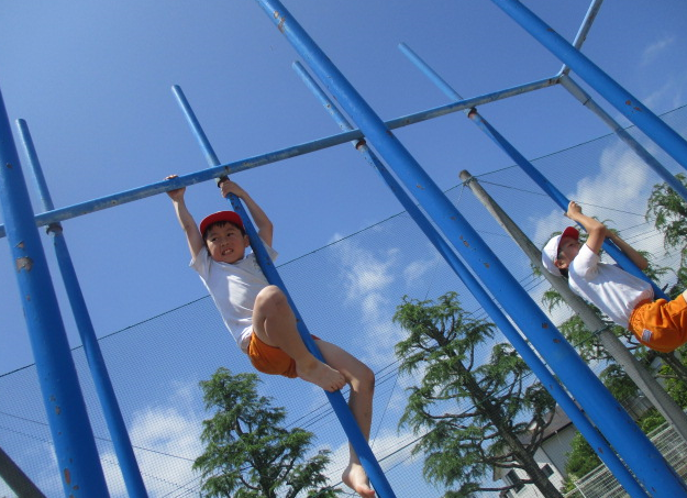 校庭で学年体育。今日ものぼり棒と鉄棒。