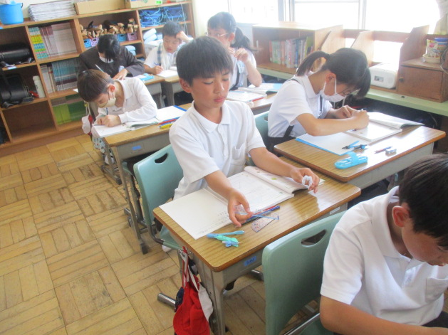 2組さんは社会の時間。弥生時代のむらの暮らし方について、視点を衣食住にして探っていました。絵には鹿をつかまえた様子がありました。