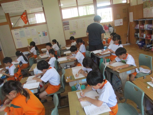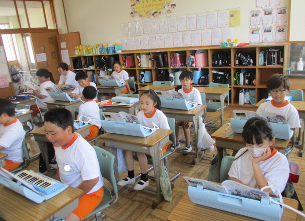 今日、先日の4年生の民謡教室に引き続き、1年生も民謡体験を行いました。