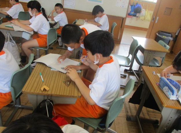 2組さんは算数の時間。分度器を使って三角形を作図中です。5年生になるとコンパスでの作図につながりますね。