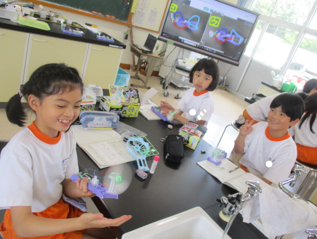 3組さんは理科の時間。直列つなぎを使って、風車をまわしてみました。