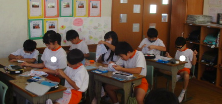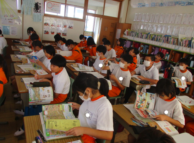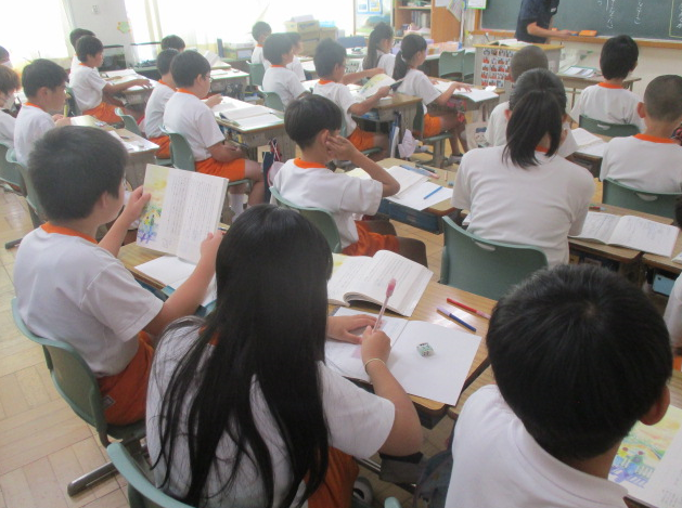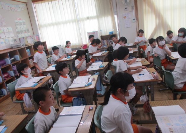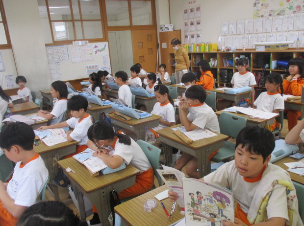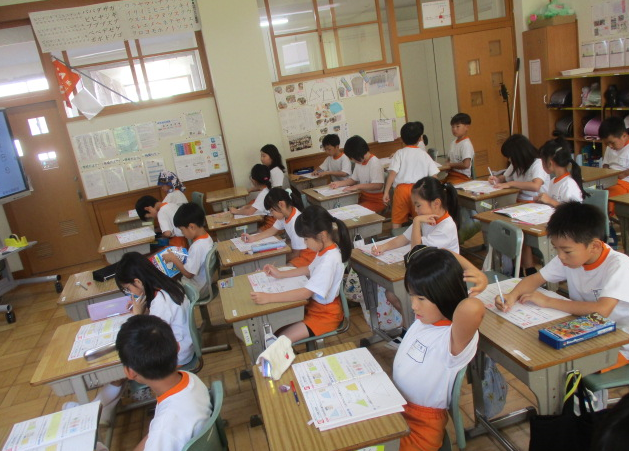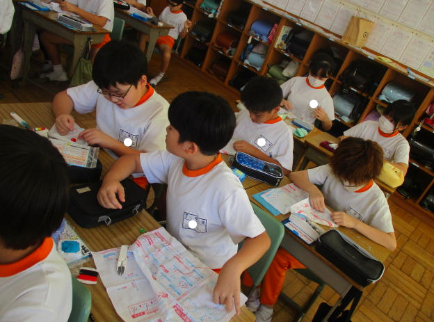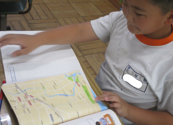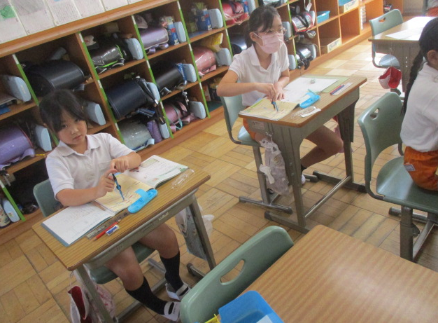 1組さんは算数の時間。縮尺のコンパスの利用の学習中。浜松市の地図を使って、「ゆみちゃんから学校までの距離」などを計測していました。浜松市はアニメ「ちびまる子ちゃん」の舞台です。ゆみこちゃんという登場人物を思い出しました。