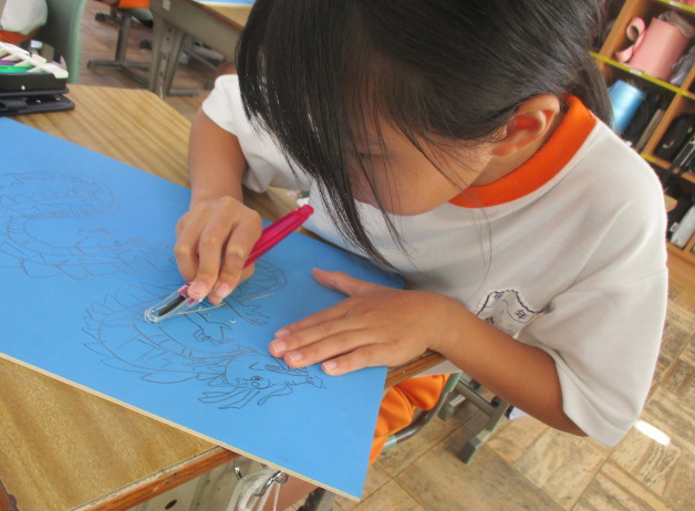 1組さんは図工の時間。彫刻刀を使って版画を作り始めました。