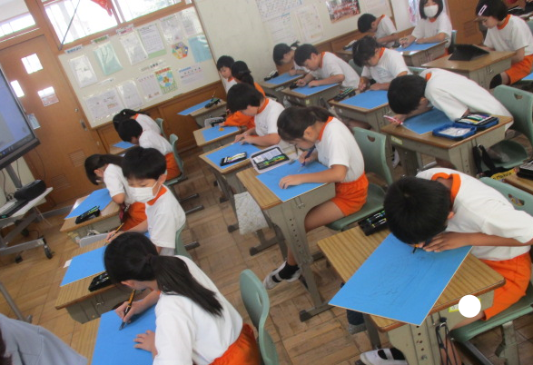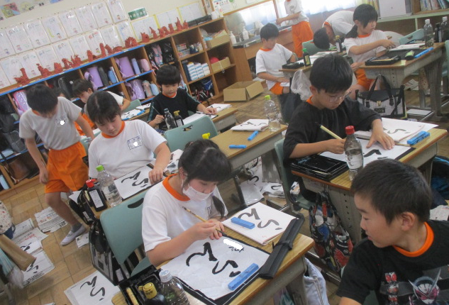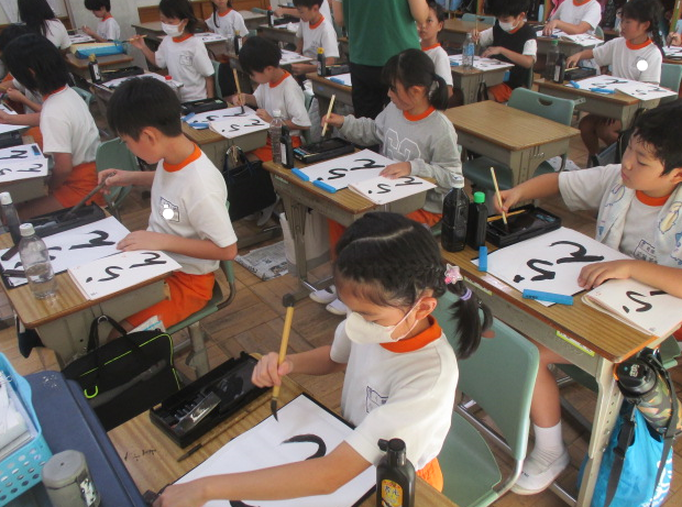 2組さんは書写の時間。「らん」を力強く書いていました。