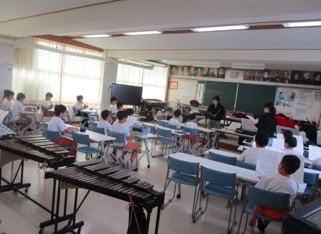 ALT(外国語指導助手)のチャールズシンガー先生が、熱心に、吹奏楽部の子どもたちに、