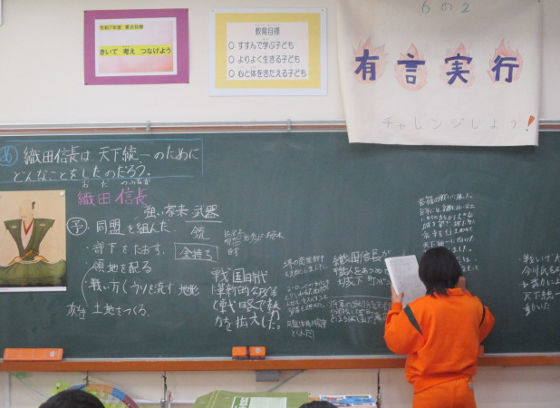 2組さんは社会の時間。織田信長について予想をもとに探究したことを黒板に書きだしていました。