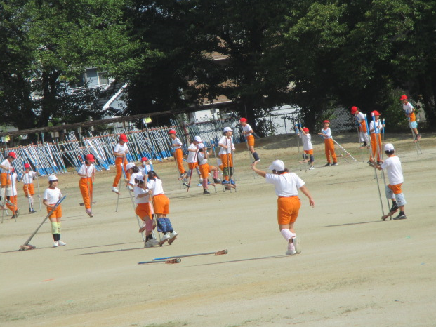 外で学年体育。いよいよ本校の特色ある教育活動の一つ、竹馬のはじまりです。