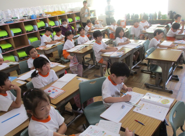 1組さんは算数の時間。「円内に直線をひいて、一番長いのはどんな時?」から円の直径の学習を導き出そうとしていました。ノートにしっかりと作図中です。