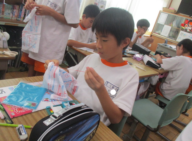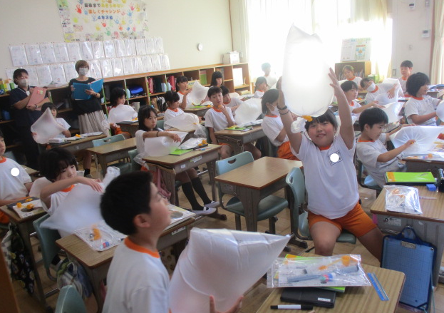 3組さんは理科の時間。空気と水の圧縮について考える学習中。大きな袋に空気を集めて、押しつぶしたり、手を離したりして、様子を確かめました。