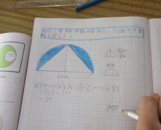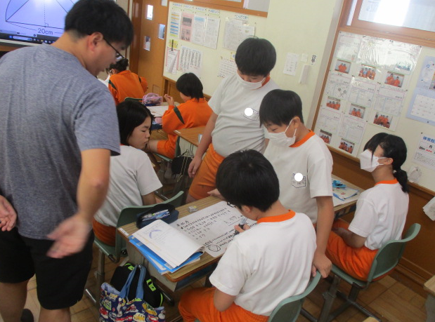 2組さんは算数の時間。複雑な求積を話し合って解決中です。