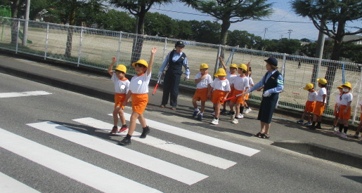 交通指導員の方々の指導のもと、歩行の仕方や横断歩道の渡り方について学習しました。