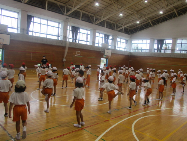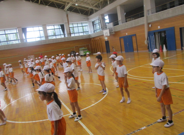 学年体育。今日はすずしくて体育館もひんやり。まずストレッチから。体がやわらかいねえ。