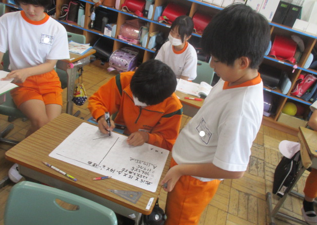 2組さんは算数の時間。おうぎ形の求積を発表前準備です。