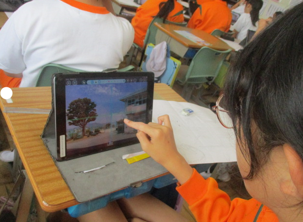 1組さんは図工の時間。空間をより奥行を出すために、撮影画像に線を入れていました。