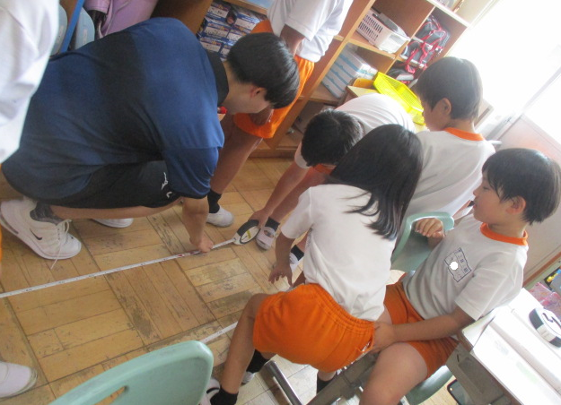 2組さんは算数の時間。巻き尺で長さ測定。