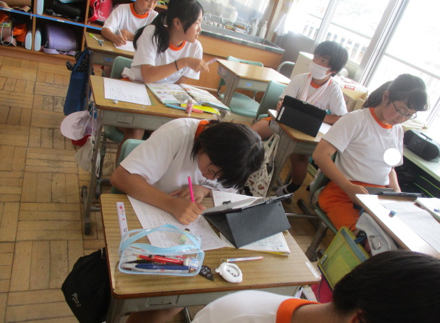 1組さんは理科の時間。授業の最後にプリントでまとめ中。