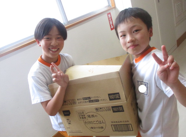市の備蓄品の食料品が支援物資として届きました。上級生や当該学年児童が手分けして、それぞれの教室へ運びました。ありがとうございました。