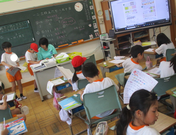 1組さんは算数の時間。プリントを解いて先生にみてもらいました。