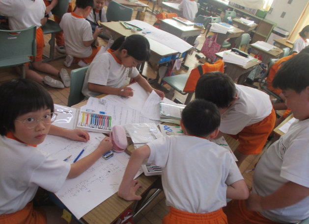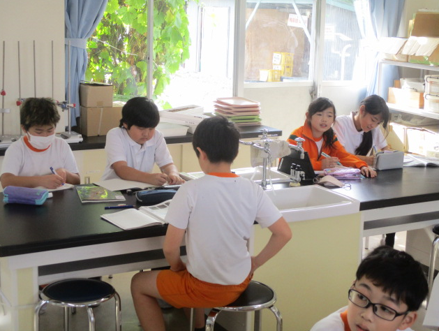 2組さんは理科の時間。雨による川の水害について学習中。校庭にも昨夜からの雨でちょっとした水の流れができていましたね。