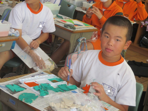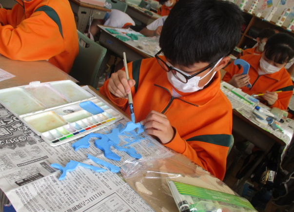 1組さんは図工の時間。糸鋸で切り出した木材をパズルや立体作品に。今日は色付け。