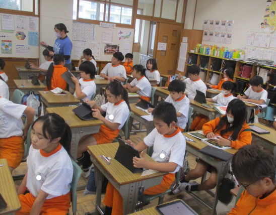 1組さんは国語の時間。話合い活動のための動画視聴中。
