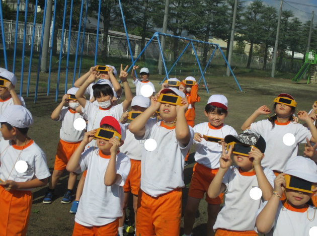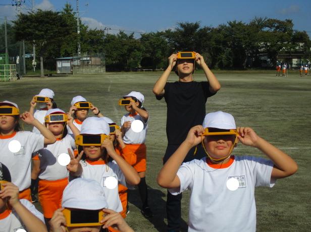 2組さんは理科の時間。遮光レンズで太陽の観察中。次の皆既日食は2035年9月2日。その頃、3年生は19歳。ダイヤモンドリングを南相馬で見るのでしょうか?それとも別の土地で見るのでしょうか?時間帯は夜8時台のようです。