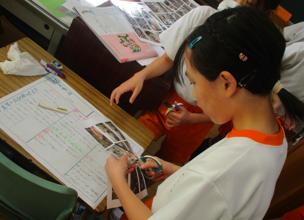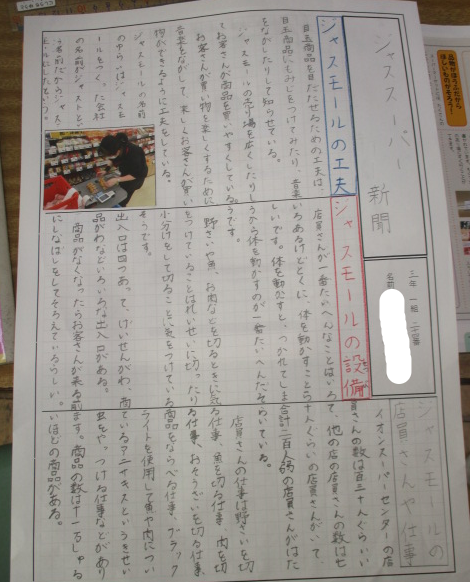 1組さんは社会の時間。スーパー見学のまとめを新聞で行っています。