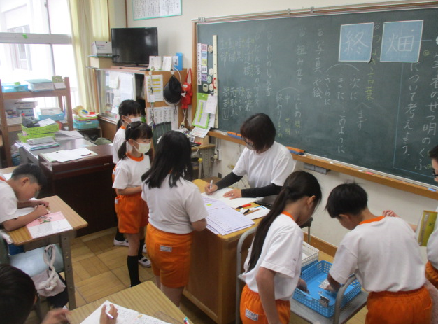 1組さんは学習を終え、家庭学習の準備。今日のシールはドナルドです。みんな丁寧に準備して、先生にチェックしてもらっています。
