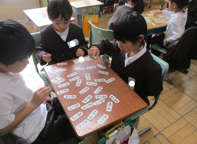 1組さんは算数ゲーム中。答えを導き出すためのたし算を探し中。大盛り上がり。