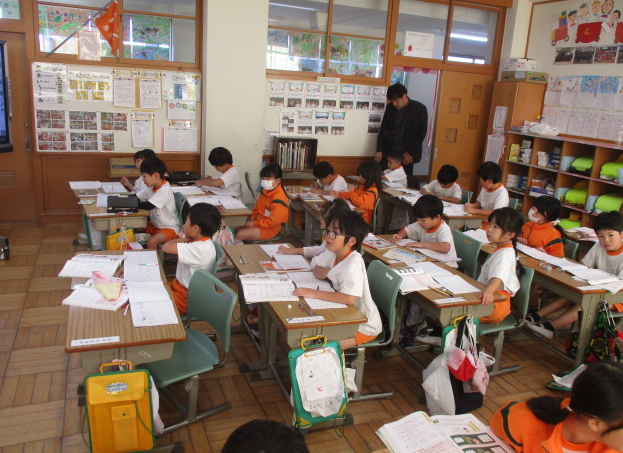 今日、先日の4年生の民謡教室に引き続き、1年生も民謡体験を行いました。