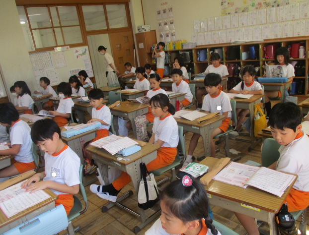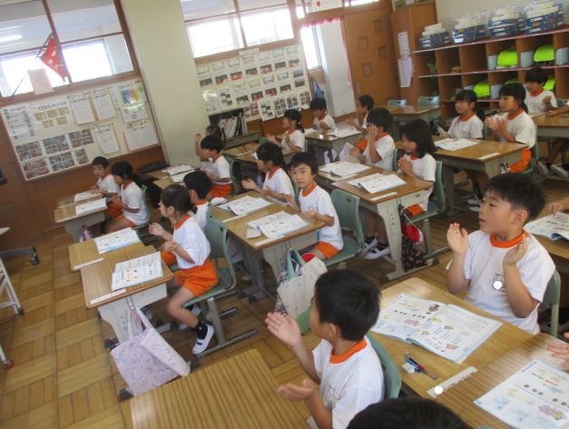 今日、先日の4年生の民謡教室に引き続き、1年生も民謡体験を行いました。