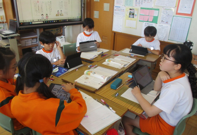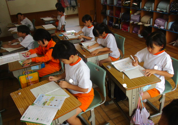 2組さんは算数の時間。いろいろなスタイルで学習中です。友達と学習したり、友達に教えてもらったり、先生に教えてもらったりと、静かに学習がすすめられていました。