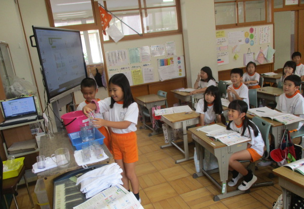 2組さんは算数の時間。リットルますをつかって、かさの学習中。実際に水をつかって実演中。