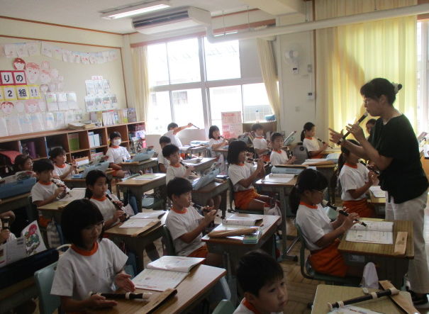 2組さんは音楽の時間。リコーダーでタンギングを使って音出しの確認中。