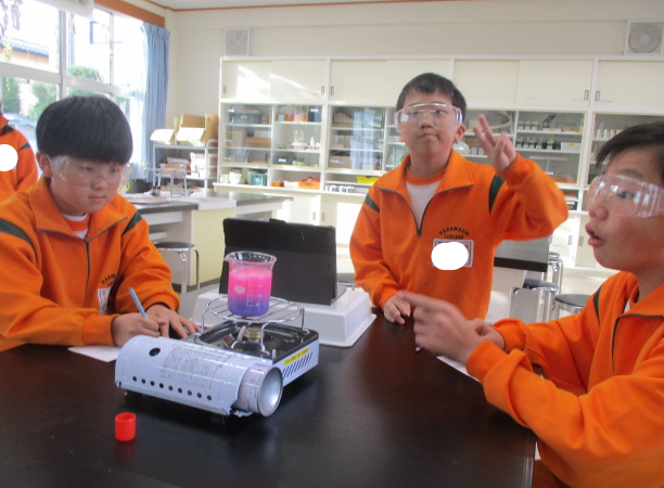 物の温まり方について実験をしています。タブレットで様子を記録し、それをもとにグループで考察中。