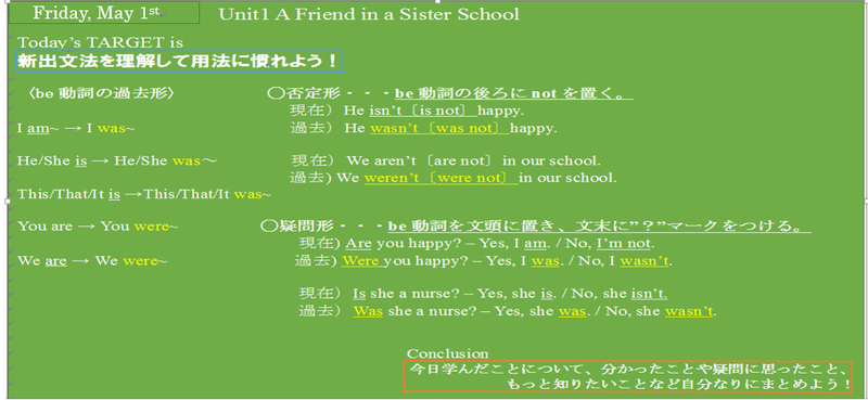 1 まず、声に出して板書事項を発音してみましょう。(音声を聞きながら◎)、板書をまとめましょう。(be動詞〔am, is, are〕の復習もしっかり行おう!)