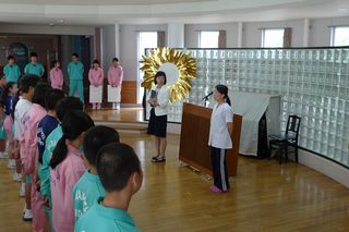 昨日、新しい調理員さんが着任しましたので、今日は全校集会の際に生徒たちに調理員の木幡さんを紹介しました。よろしくお願いします。