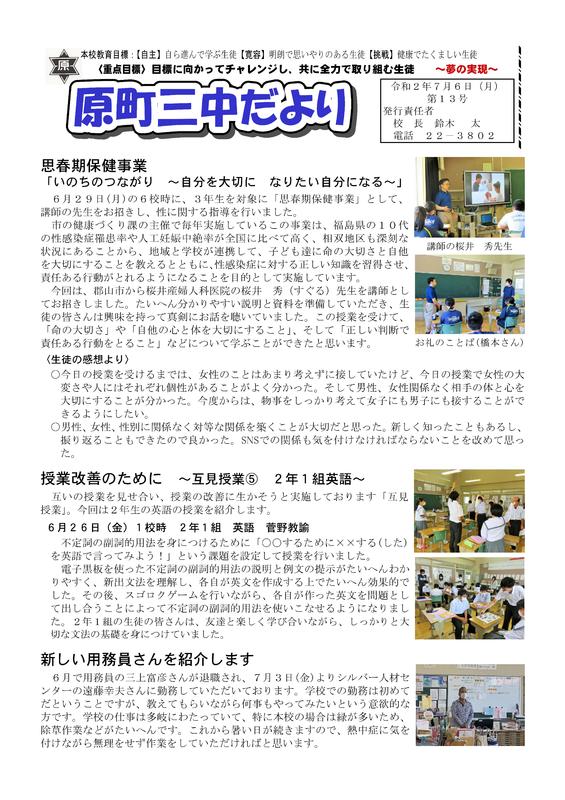 原町三中だより第13号をアップしましたのでご覧ください。「学校だより」からもご覧になれます。