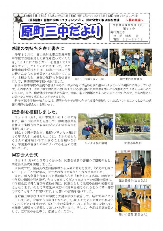 原町三中だより第47号をアップしましたのでご覧ください。「学校だより」からもご覧になれます。
