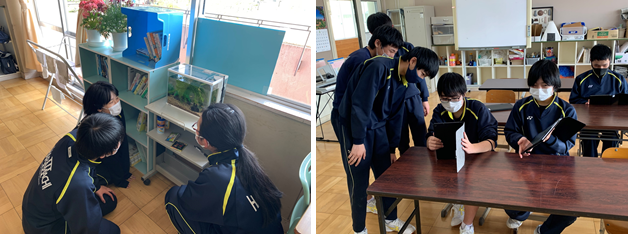 【各委員会の仕事も一生懸命に取り組んでいます】本の貸し出しをする図書委員会と栄養素のお知らせボードの使い方を後輩に説明する保健委員会